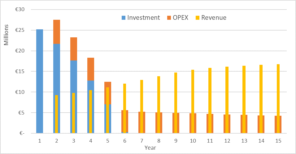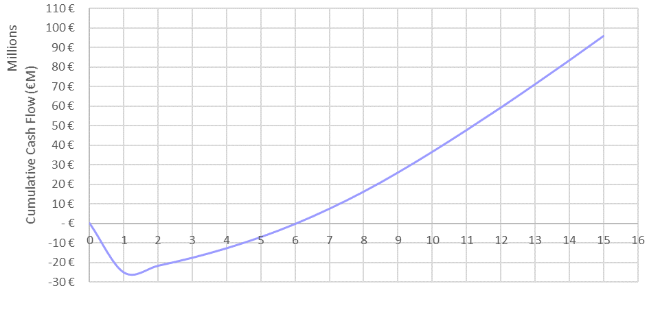Starting from low PGM recovery rate in the first year of production as low as 32% and improving the recovery rate to only 75% after 15 years, a total average production cost of €12.600 per kg of PGM could be achieved. This  would result in a payback period of 6 years (see Figure 2) and an accumulated revenue of almost 4 times the initial investment that would be reached in the fifteenth year of production.